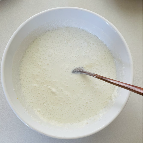 Combine and mix your dry ingredients. Then add your coconut cream (make sure you shake the can) and your soda water. Stir the ingredients together. If your mixture is too thick, add your water slowly. You want the batter to be thin and runny. If the batter is too thick, add more water. Add your sliced scallions, stir, cover, and put it in the fridge for at least 30 minutes. While your batter is resting, prep the rest of your ingredients.