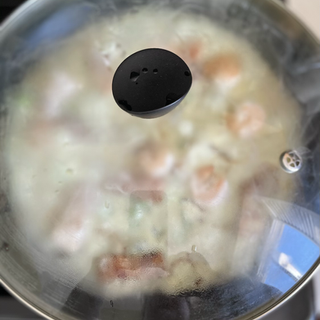 When it’s time to fry your Bánh Xèo, heat your frying pan on medium heat. Make sure it’s HOT. Fry your meat, then shrimp and onions. Stir your batter with your ladle and ladle in enough batter until it covers the surface of your pan. Don’t add too much, or your Bánh Xèo will be too thick, add your bean sprouts. Pop the lid on your frying pan and cook for a minute and a half on medium heat.
