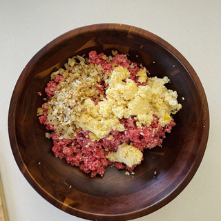 Chop your onion finely and sauté in a frying pan until soft and slightly caramelized; set aside to cool. Combine your eggs, panko and milk into a bowl, and mix lightly. I don't always combine the eggs, panko and milk separately; However, it does make it easier to combine into the meat mixture later.