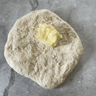 Place dabs of butter into your dough, fold it over and begin to knead the dough.
