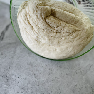 Transfer your dough onto your clean work surface, cover with a damp cloth and let rest for 10 minutes. After 10 minutes, the dough will feel more supple and will be ready to knead. Knead until a soft dough forms. Shape the dough into a ball, and then flatten it with your hands.